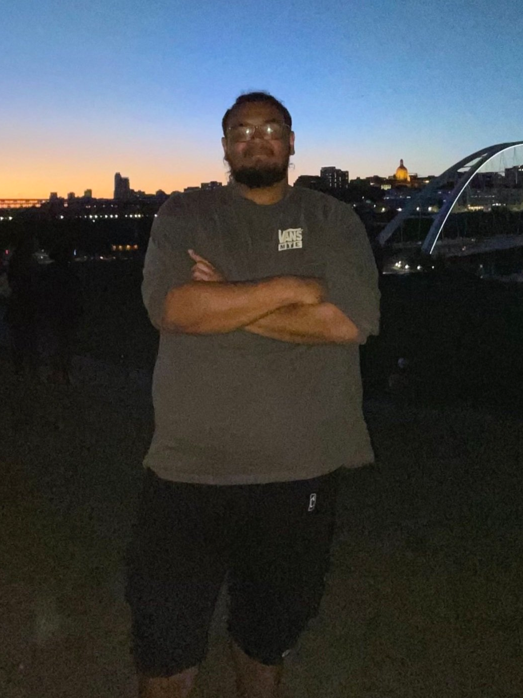 Man with glasses, beard, and smiling expression standing with arms crossed at dusk, city skyline in the background.